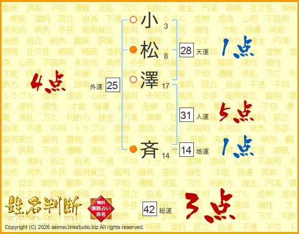 生活面を象徴する運勢です。外部から受ける影響力を表し、結婚運、家庭運や職場、環境への順応性を表します。総運から人運を引いた画数。姓や名が1文字の場合を除く。