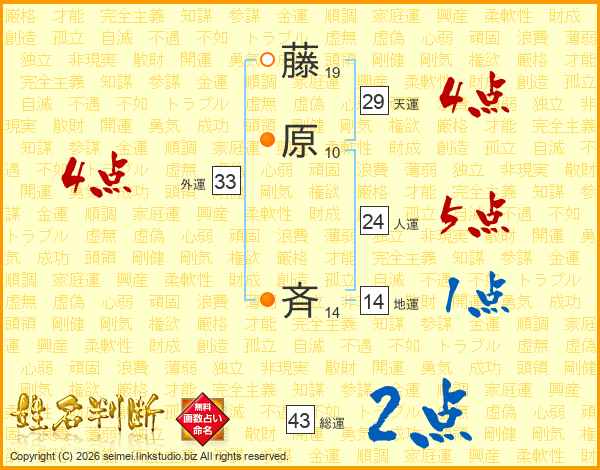 藤原斉さんの総運は43画の2点!