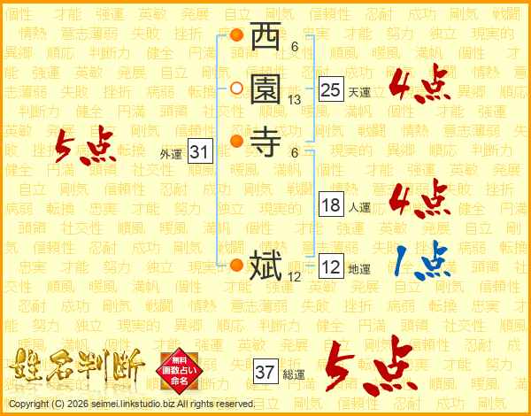 生活面を象徴する運勢です。外部から受ける影響力を表し、結婚運、家庭運や職場、環境への順応性を表します。総運から人運を引いた画数。姓や名が1文字の場合を除く。
