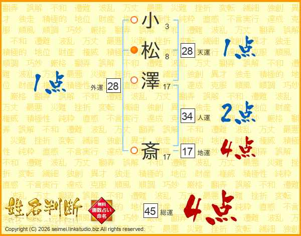 生活面を象徴する運勢です。外部から受ける影響力を表し、結婚運、家庭運や職場、環境への順応性を表します。総運から人運を引いた画数。姓や名が1文字の場合を除く。