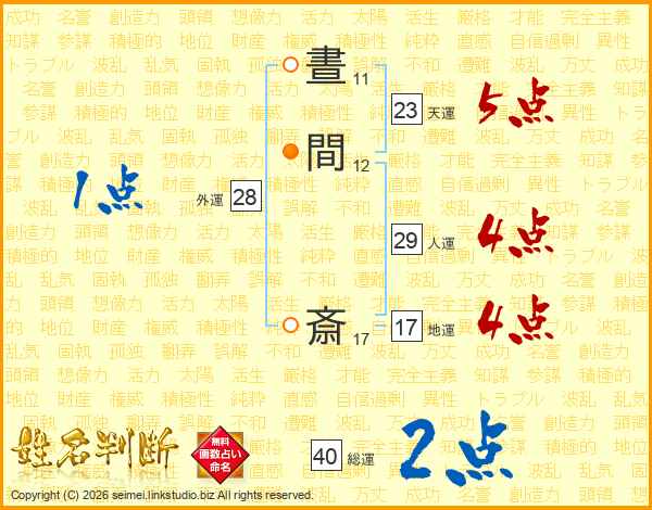 生活面を象徴する運勢です。外部から受ける影響力を表し、結婚運、家庭運や職場、環境への順応性を表します。総運から人運を引いた画数。姓や名が1文字の場合を除く。