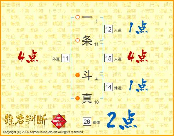 あなたの人生を表す1番重要な運勢です。生涯を通じて影響する総合運となり、主に50歳以降の晩年期に影響を及ぼします。苗字と名前の合計画数。