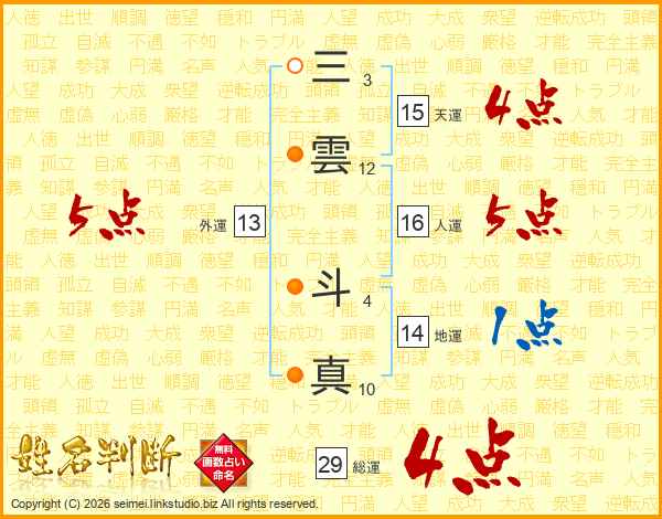 あなたの人生を表す1番重要な運勢です。生涯を通じて影響する総合運となり、主に50歳以降の晩年期に影響を及ぼします。苗字と名前の合計画数。