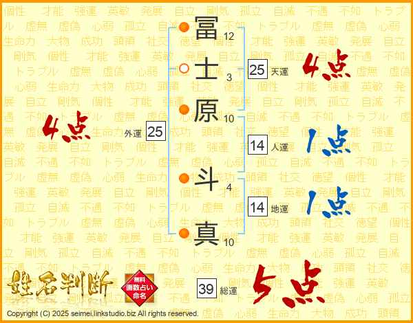 冨(12画)士(3画)原(10画) 斗(4画)真(10画)