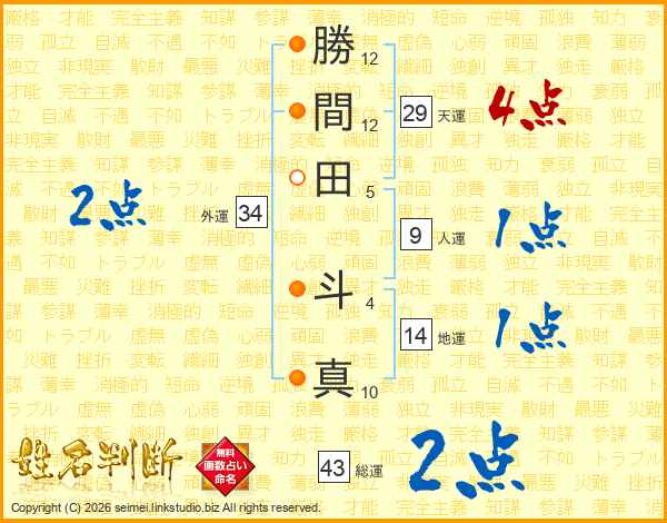 勝(12画)間(12画)田(5画) 斗(4画)真(10画)