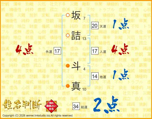 坂(7画)詰(13画) 斗(4画)真(10画)