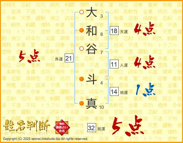 生活面を象徴する運勢です。外部から受ける影響力を表し、結婚運、家庭運や職場、環境への順応性を表します。総運から人運を引いた画数。姓や名が1文字の場合を除く。