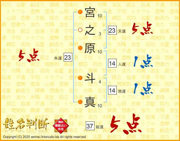 宮(10画)之(3画)原(10画) 斗(4画)真(10画)