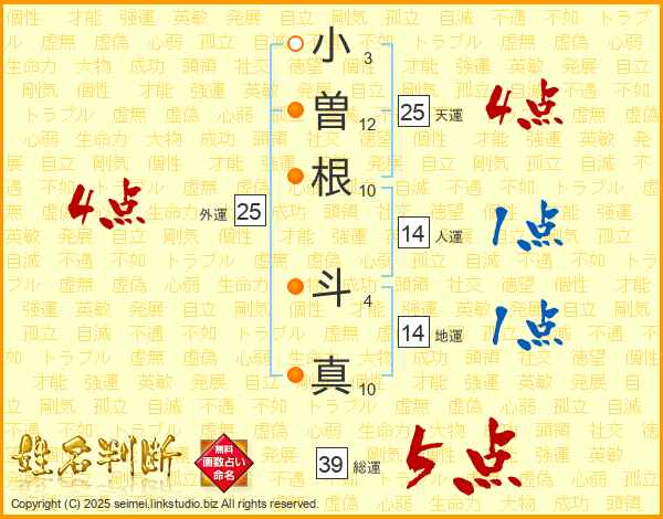 小(3画)曽(12画)根(10画) 斗(4画)真(10画)