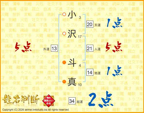 生活面を象徴する運勢です。外部から受ける影響力を表し、結婚運、家庭運や職場、環境への順応性を表します。総運から人運を引いた画数。姓や名が1文字の場合を除く。