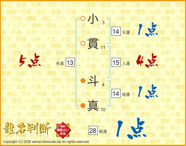 生活面を象徴する運勢です。外部から受ける影響力を表し、結婚運、家庭運や職場、環境への順応性を表します。総運から人運を引いた画数。姓や名が1文字の場合を除く。