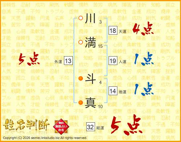 生活面を象徴する運勢です。外部から受ける影響力を表し、結婚運、家庭運や職場、環境への順応性を表します。総運から人運を引いた画数。姓や名が1文字の場合を除く。