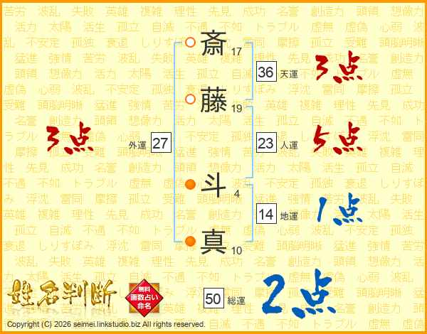 斎(17画)藤(19画) 斗(4画)真(10画)