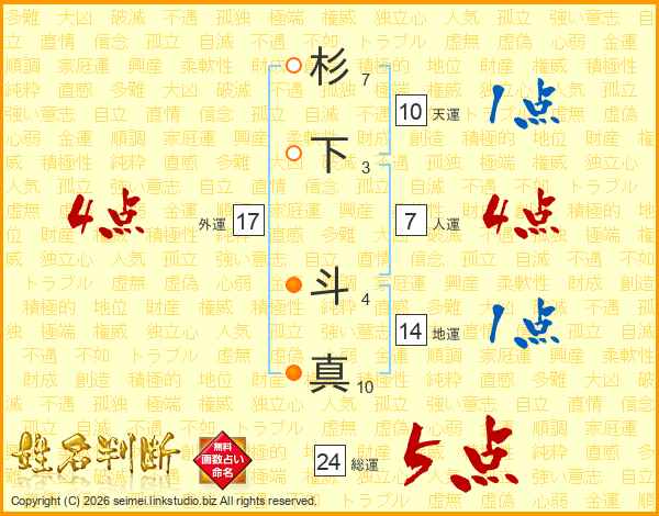 生活面を象徴する運勢です。外部から受ける影響力を表し、結婚運、家庭運や職場、環境への順応性を表します。総運から人運を引いた画数。姓や名が1文字の場合を除く。