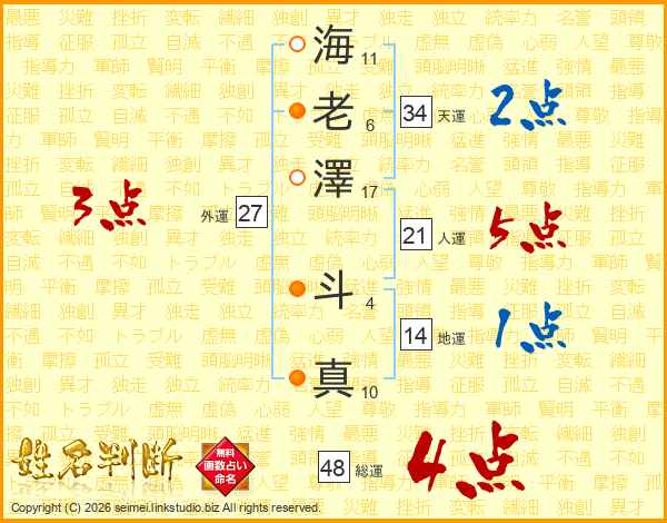 海(11画)老(6画)澤(17画) 斗(4画)真(10画)