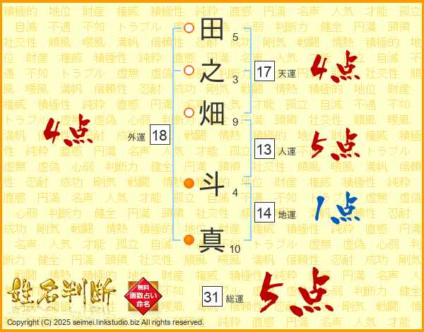 田(5画)之(3画)畑(9画) 斗(4画)真(10画)