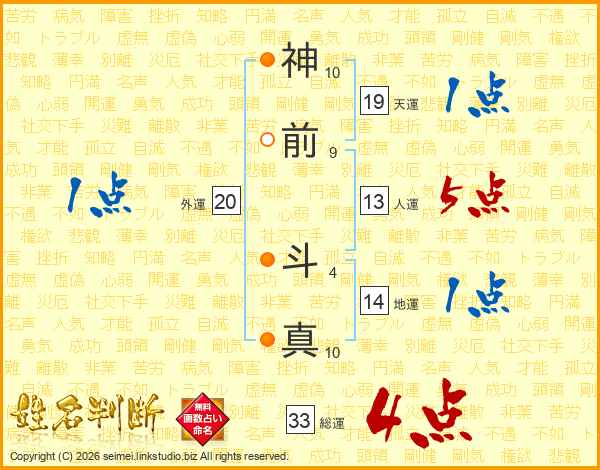 生活面を象徴する運勢です。外部から受ける影響力を表し、結婚運、家庭運や職場、環境への順応性を表します。総運から人運を引いた画数。姓や名が1文字の場合を除く。