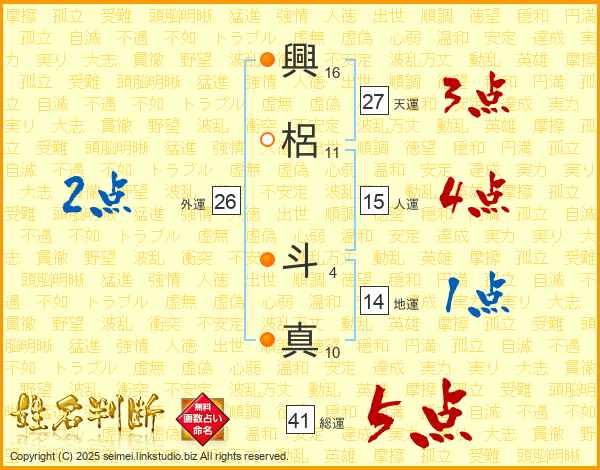 画数の奇数(○陽)と偶数(●陰)の配列で吉凶を占います。どちらかにかたよる名前は大凶名で避ける必要があります。画数の奇数偶数。