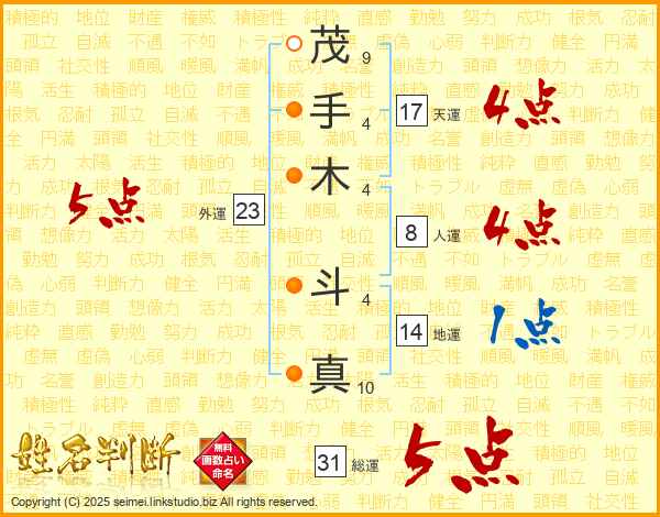 茂(9画)手(4画)木(4画) 斗(4画)真(10画)