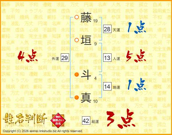 藤(19画)垣(9画) 斗(4画)真(10画)