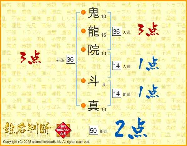 鬼(10画)龍(16画)院(10画) 斗(4画)真(10画)