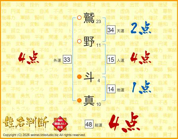 鷲(23画)野(11画) 斗(4画)真(10画)