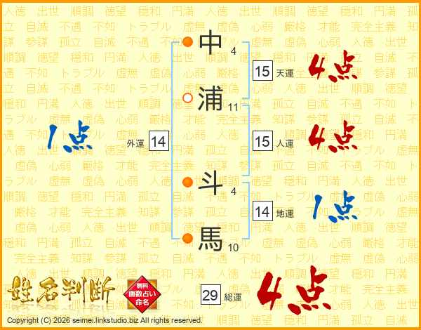 中(4画)浦(11画) 斗(4画)馬(10画)