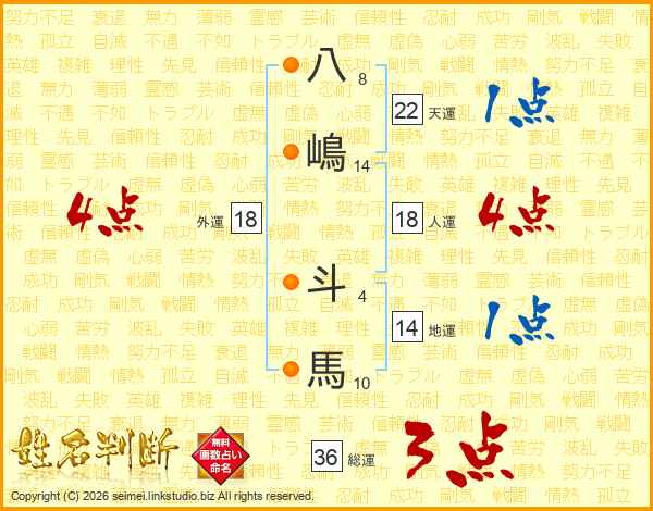 八(8画)嶋(14画) 斗(4画)馬(10画)