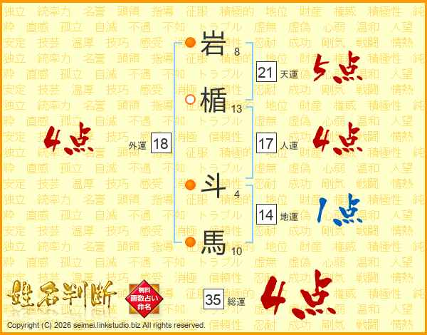 岩(8画)楯(13画) 斗(4画)馬(10画)