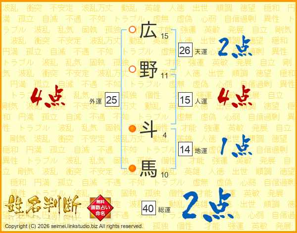 生活面を象徴する運勢です。外部から受ける影響力を表し、結婚運、家庭運や職場、環境への順応性を表します。総運から人運を引いた画数。姓や名が1文字の場合を除く。