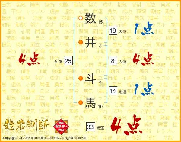 生活面を象徴する運勢です。外部から受ける影響力を表し、結婚運、家庭運や職場、環境への順応性を表します。総運から人運を引いた画数。姓や名が1文字の場合を除く。