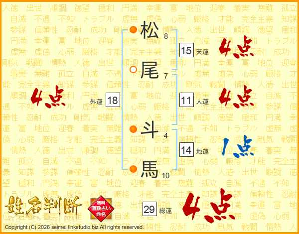 松(8画)尾(7画) 斗(4画)馬(10画)