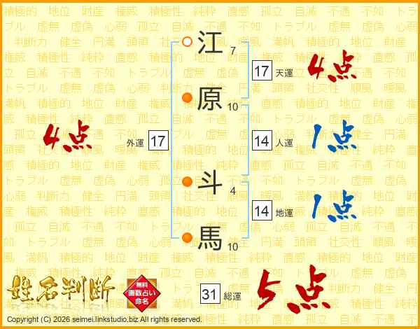 生活面を象徴する運勢です。外部から受ける影響力を表し、結婚運、家庭運や職場、環境への順応性を表します。総運から人運を引いた画数。姓や名が1文字の場合を除く。