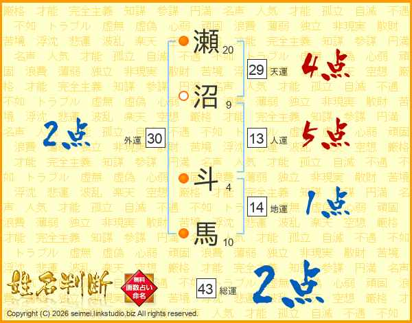 瀬沼斗馬さんの総運は43画の2点!