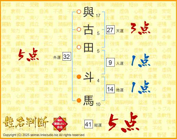 與(17画)古(5画)田(5画) 斗(4画)馬(10画)