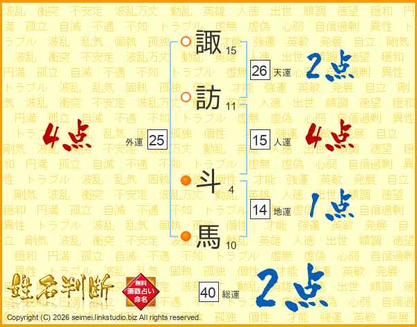 諏(15画)訪(11画) 斗(4画)馬(10画)