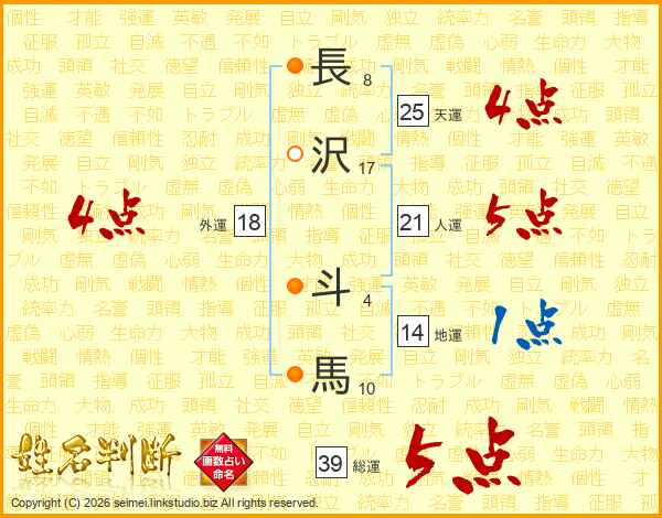長(8画)沢(17画) 斗(4画)馬(10画)