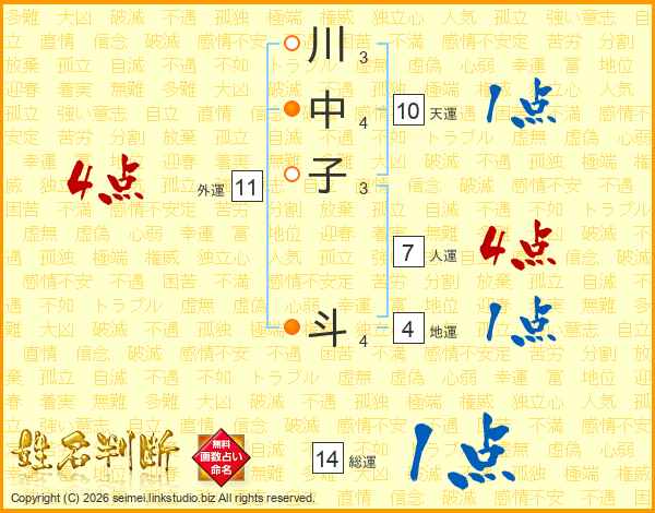 生活面を象徴する運勢です。外部から受ける影響力を表し、結婚運、家庭運や職場、環境への順応性を表します。総運から人運を引いた画数。姓や名が1文字の場合を除く。