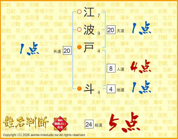 生活面を象徴する運勢です。外部から受ける影響力を表し、結婚運、家庭運や職場、環境への順応性を表します。総運から人運を引いた画数。姓や名が1文字の場合を除く。