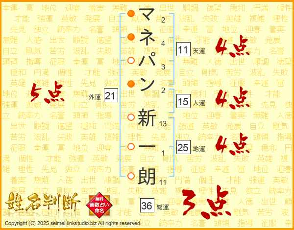 マ(2画)ネ(4画)パ(3画)ン(2画) 新(13画)一(1画)朗(11画)