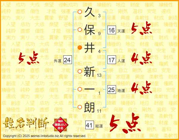 久(3画)保(9画)井(4画) 新(13画)一(1画)朗(11画)