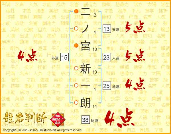 二(2画)ノ(1画)宮(10画) 新(13画)一(1画)朗(11画)