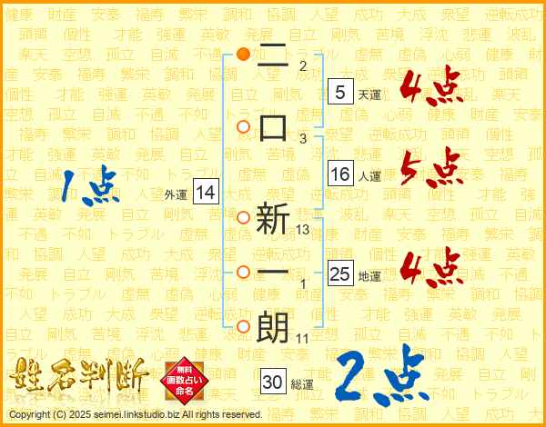生活面を象徴する運勢です。外部から受ける影響力を表し、結婚運、家庭運や職場、環境への順応性を表します。総運から人運を引いた画数。姓や名が1文字の場合を除く。