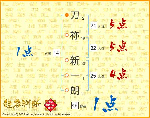 刀(2画)祢(19画) 新(13画)一(1画)朗(11画)