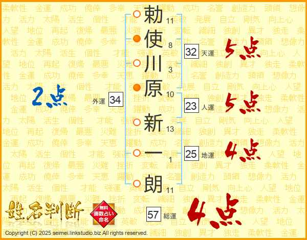 勅(11画)使(8画)川(3画)原(10画) 新(13画)一(1画)朗(11画)