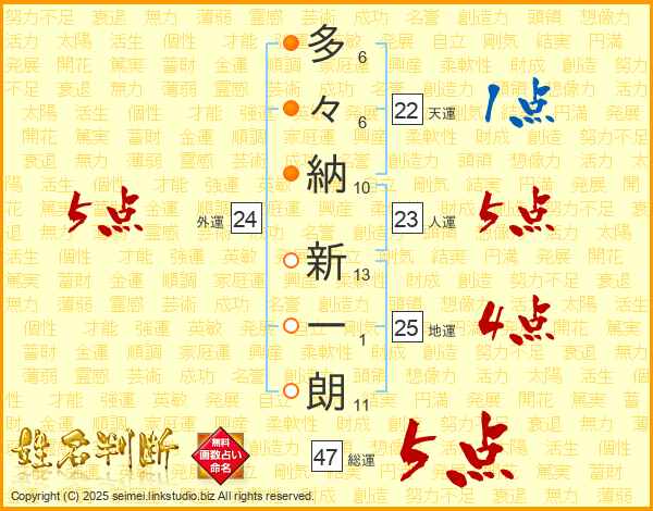 多(6画)々(6画)納(10画) 新(13画)一(1画)朗(11画)