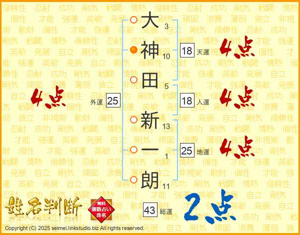 大(3画)神(10画)田(5画) 新(13画)一(1画)朗(11画)