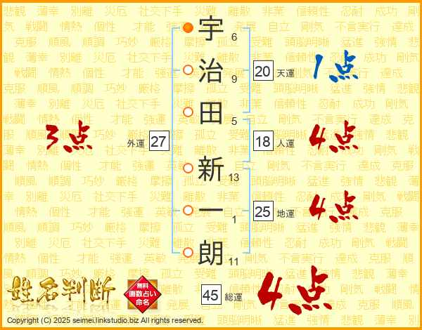 宇(6画)治(9画)田(5画) 新(13画)一(1画)朗(11画)