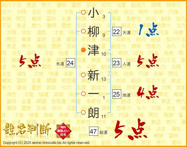小(3画)柳(9画)津(10画) 新(13画)一(1画)朗(11画)