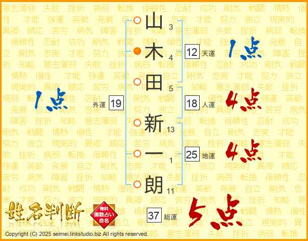 山(3画)木(4画)田(5画) 新(13画)一(1画)朗(11画)